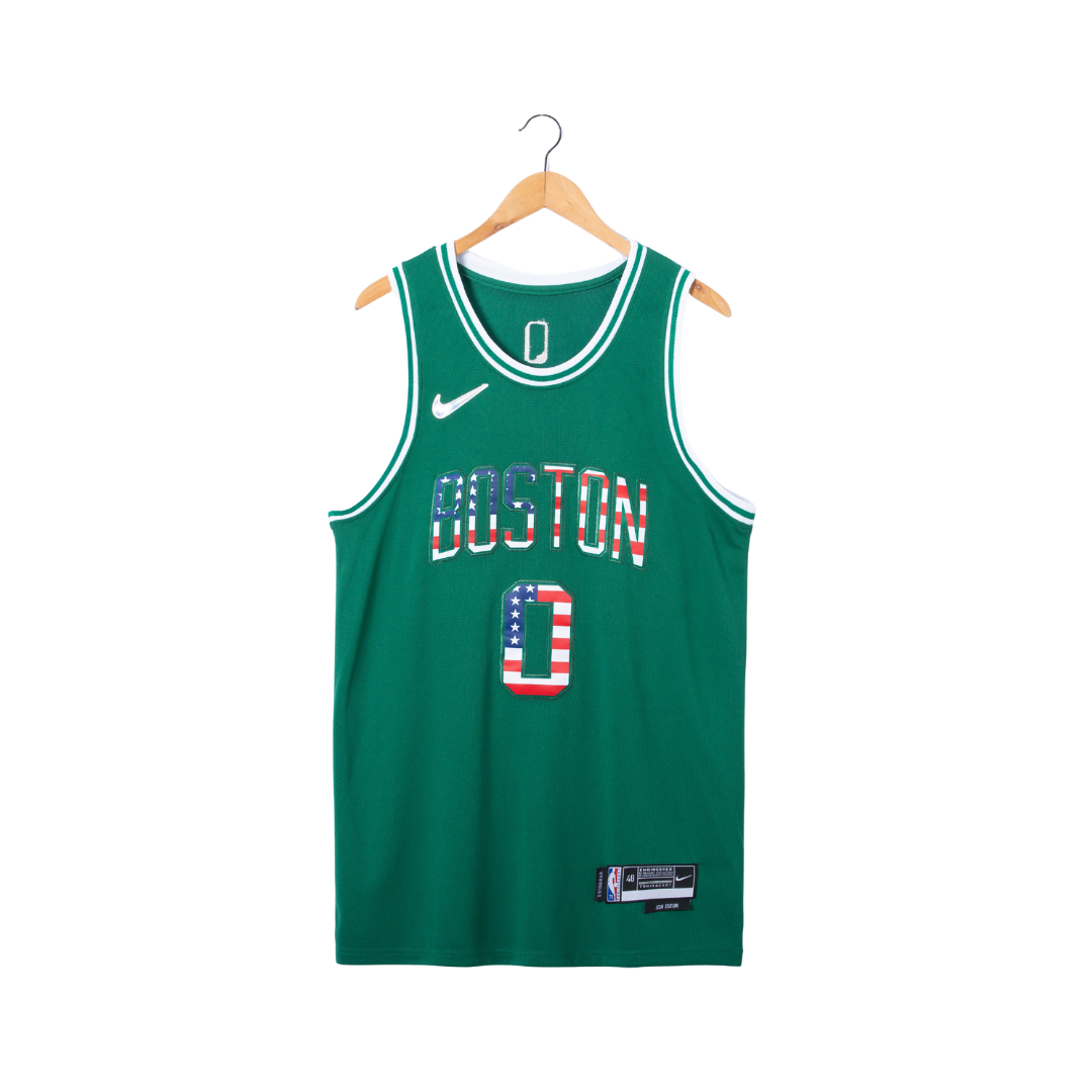 Show your support for the Boston Celtics in style with this premium USA Flag Design by Nike 2022-2023 Green Jersey #0. Perfect for game days, casual wear, or as a collectible item, this jersey blends iconic NBA design with national pride. Made from high-quality, breathable fabric, it ensures comfort whether you’re cheering on your team or just showing off your Celtics pride. Featuring a bold USA flag motif and the number 0, it’s a standout piece for fans of all ages.