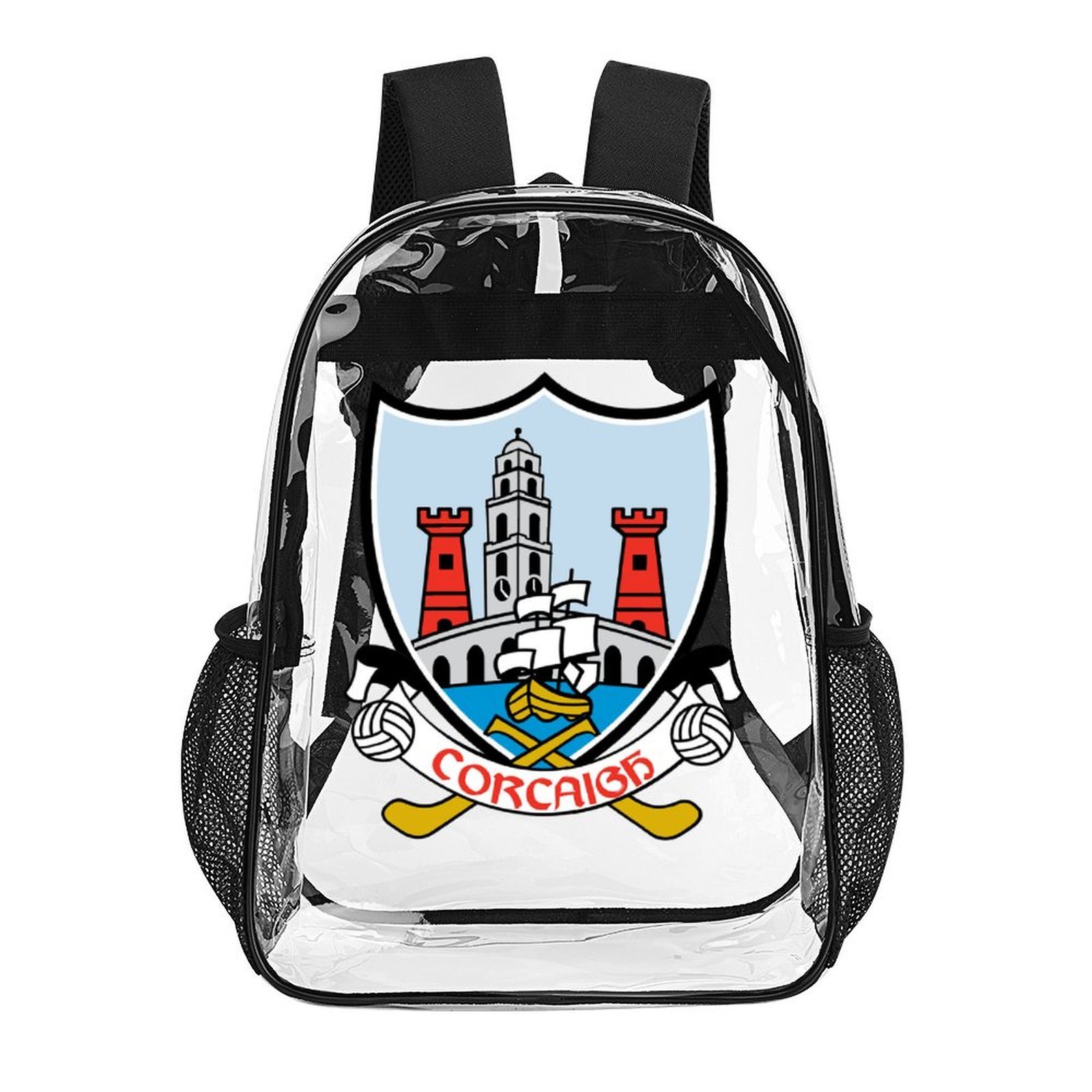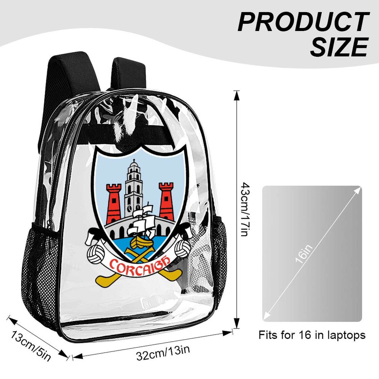 Show your pride for Cork GAA with this stylish and durable backpack, perfect for both casual wear and supporting your county team. Made from high-quality, water-resistant PVC material, this clear backpack features the iconic Cork crest, with its distinctive towers, ship, and hurling elements—symbols that represent the proud history and heritage of Cork. With its spacious interior that fits laptops up to 16 inches and practical side pockets, this backpack is both functional and fashionable.
