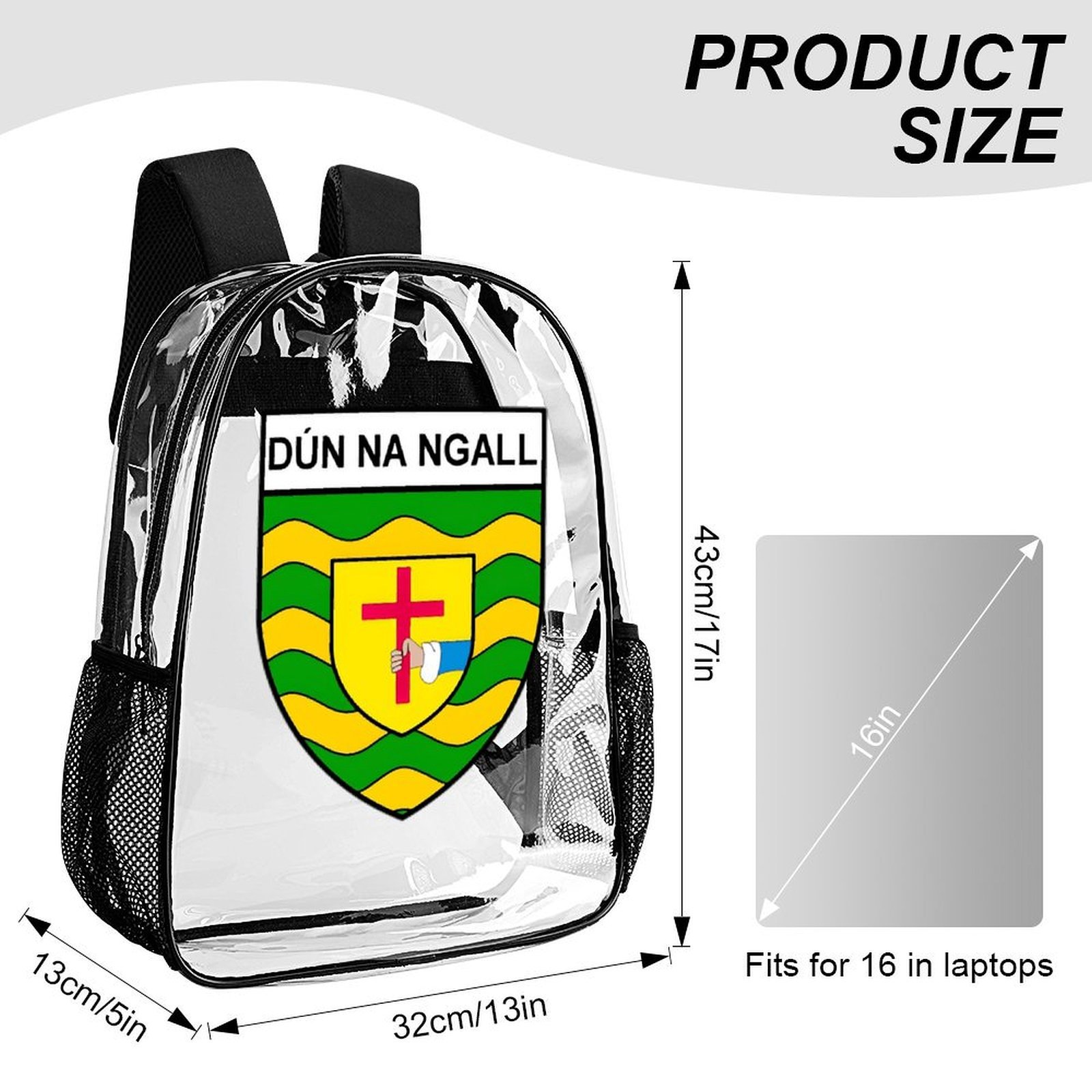 Show your pride for Donegal GAA with this stylish and durable clear backpack, perfect for both casual wear and supporting your county team. Made from high-quality, water-resistant PVC material, this clear backpack features the iconic Donegal crest, adorned with the county’s distinctive symbols—representing the proud history and heritage of Donegal. With its spacious interior that fits laptops up to 16 inches and practical side pockets, this backpack is both functional and fashionable.