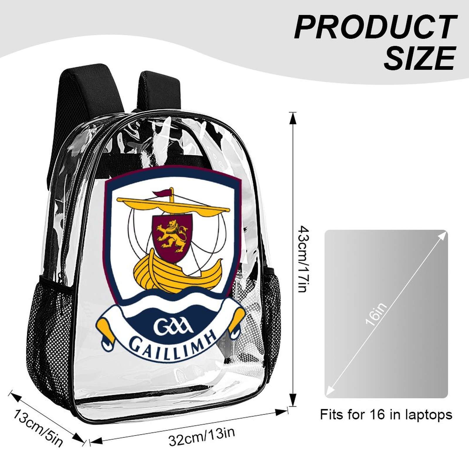 Show your pride for Galway GAA with this stylish and durable backpack, perfect for both casual wear and supporting your county team. Made from high-quality, clear PVC material, this transparent backpack features the iconic Galway crest, showcasing the traditional Galway ship emblem and the GAA insignia. Whether you’re heading to a game or out and about, this backpack blends functionality and pride for your county.